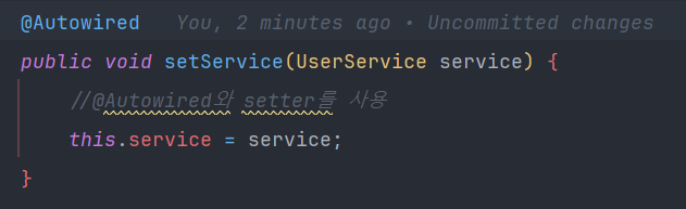 setter와 @Autowired 어노테이션을 사용 , UserService에 final 키워드를 빼줘야한다.